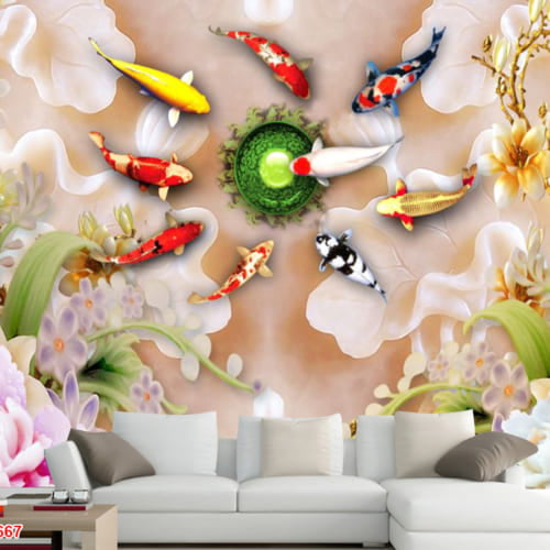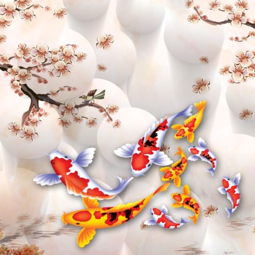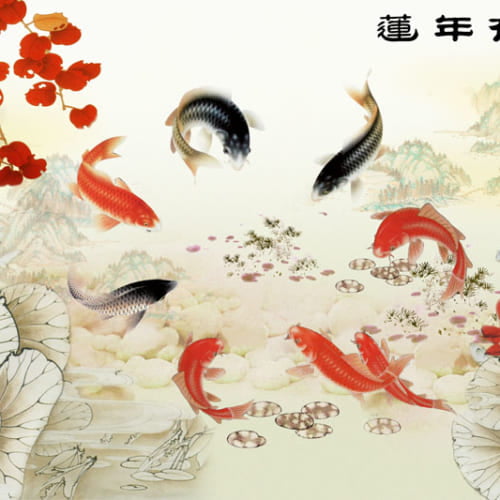 Tranh Cửu Ngư 064/ In Trên Chất Liệu Vải Lụa Kim Tuyến Nguyên Khổ