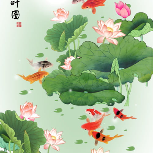 Tranh Cửu Ngư 039/ In Trên Chất Liệu Vải Lụa Kim Tuyến Nguyên Khổ