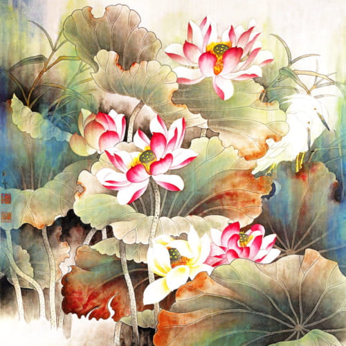 Tranh Hoa Lá Hoa Sen HN-0081/ In Trên Chất Liệu Vải Lụa Kim Tuyến Nguyên Khổ
